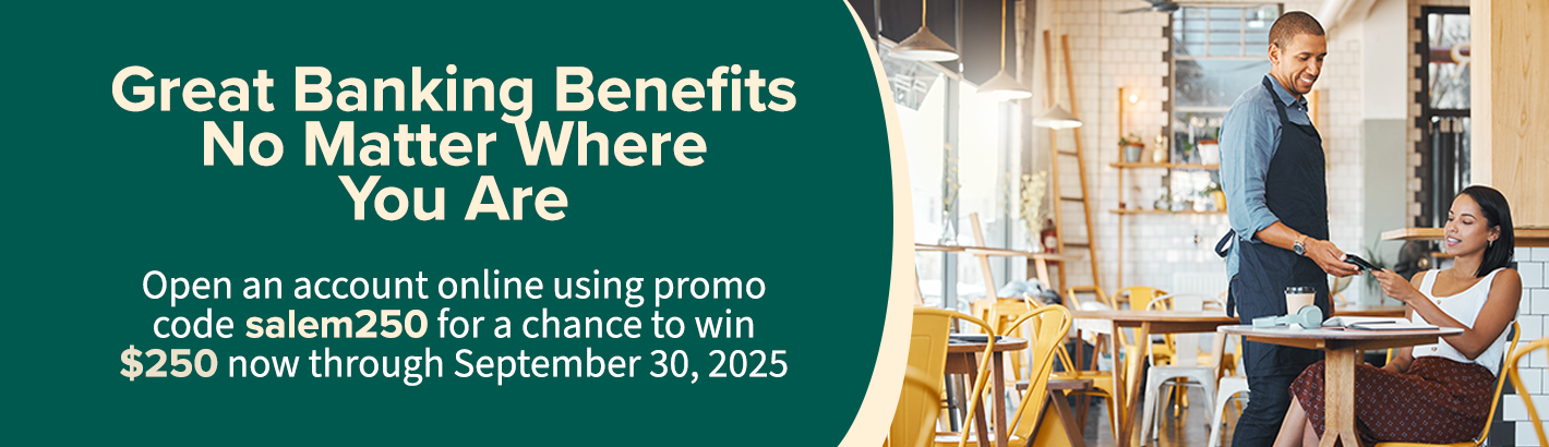 Open an account online (with promo code salem250) for a chance to win $250* now through September 30, 2025.